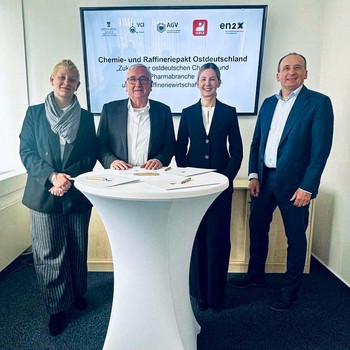 Die Unterzeichner – Michael Richter; Minister für Wirtschaft, Tourismus, Landwirtschaft und Forsten des Landes Sachsen-Anhalt, Nora Schmidt-Kesseler; Hauptgeschäftsführerin Arbeitgeberverband Nordostchemie e.V., Verband der Chemischen Industrie e.V., Landesverband Nordost, Stephanie Albrecht-Suliak; Landesbezirksleiterin; IGBCE Landesbezirk Nordost sowie Prof. Dr. Christian Küchen; Hauptgeschäftsführer; Wirtschaftsverband Fuels und Energie e.V., en2x – setzen ein wichtiges gemeinsames Zeichen.